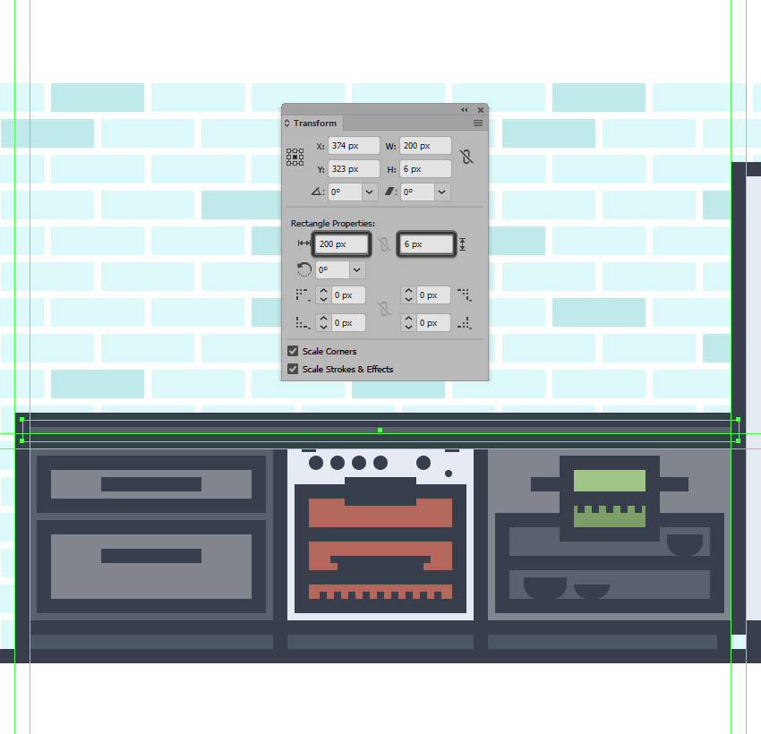 1.在两个橱柜和烤箱上面绘制一个200 x6 px(#5A616D)的矩形,以及它的轮廓描边大小为4 x(#363C4C),编组。