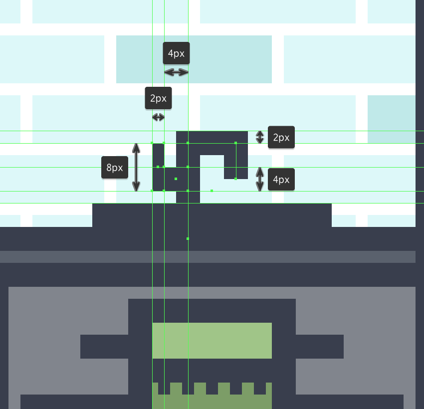5.绘制窗户的手把手:绘制一个16 x 4 px的矩形(#363c4c),与窗户框架的右边缘对齐。完成后将整个窗户的形状编组。