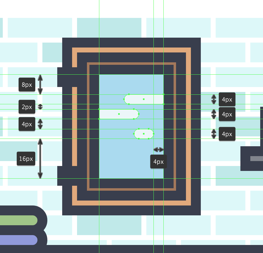 3.绘制窗户的铰链:绘制2个10 x 8 px(#363C4C),其垂直距离为32px.编组之后(Control-G)与在窗口框架的左边缘的中心对齐。