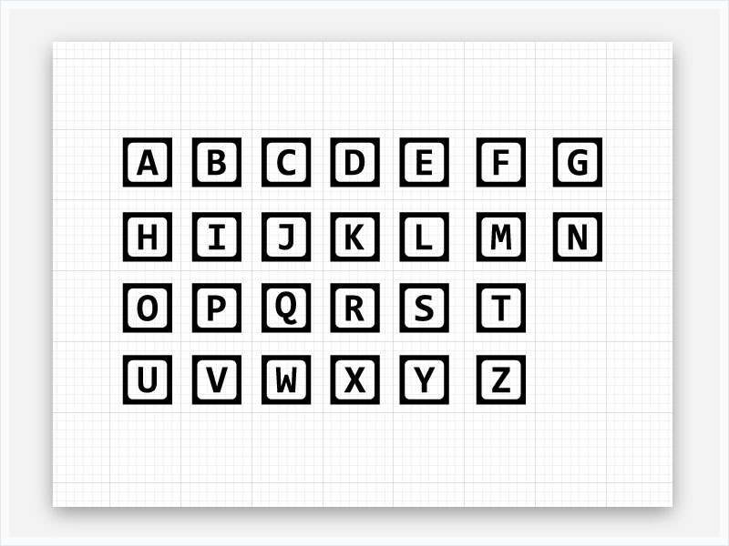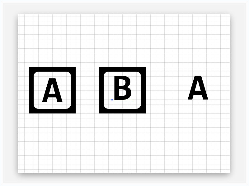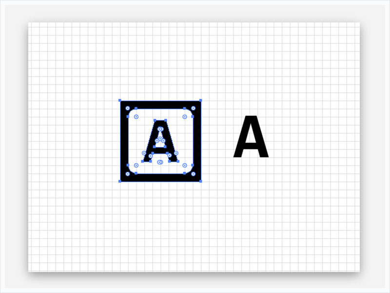 (4)选择类型工具(T),添加大写“A”,选择Consolas字体,粗体,40px,颜色设置为黑色(R=0 G=0 B=0)。确保你的文字仍然被选中,复制副本再右键创建轮廓(Shift-Control-O),水平垂直居中对齐画板,将文本和边框转换为复合路径(对象>复合路径>建立/Control-8)。