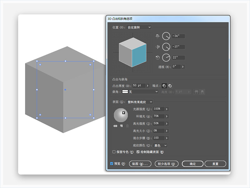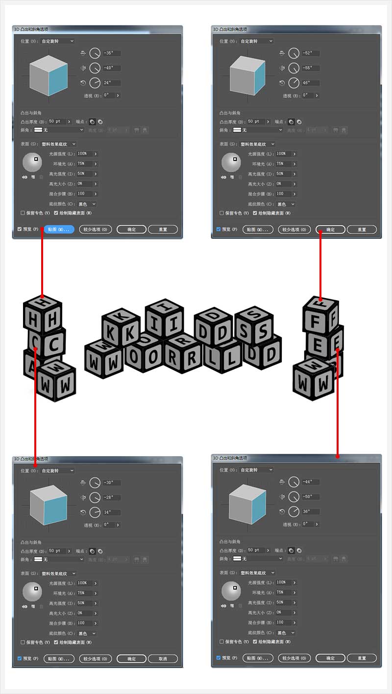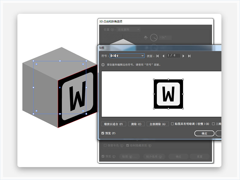(2)选中灰色方块,并进入效果> 3D>拉伸和斜面。单击更多选项按钮并输入下面显示的所有属性。不要忘记检查“ 绘制隐藏面”框,然后单击“ 贴图”按钮。打开符号下拉菜单并添加“ W ”符号,使用这些箭头按钮从表面1切换到表面5,并添加相同的符号,旋转90度。移动到Surface 6,添加相同的符号,然后单击OK按钮。具体操作如下图所示。
