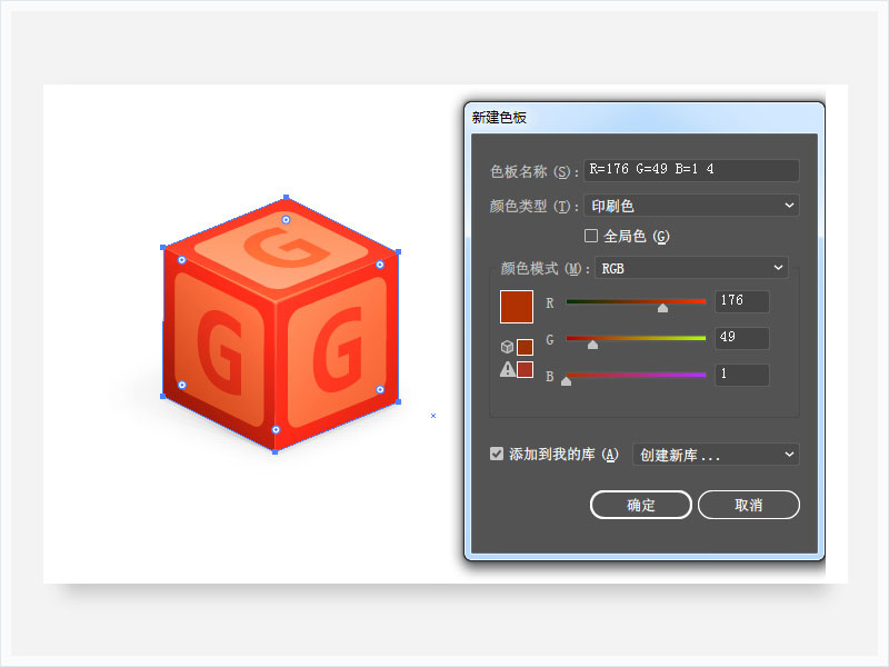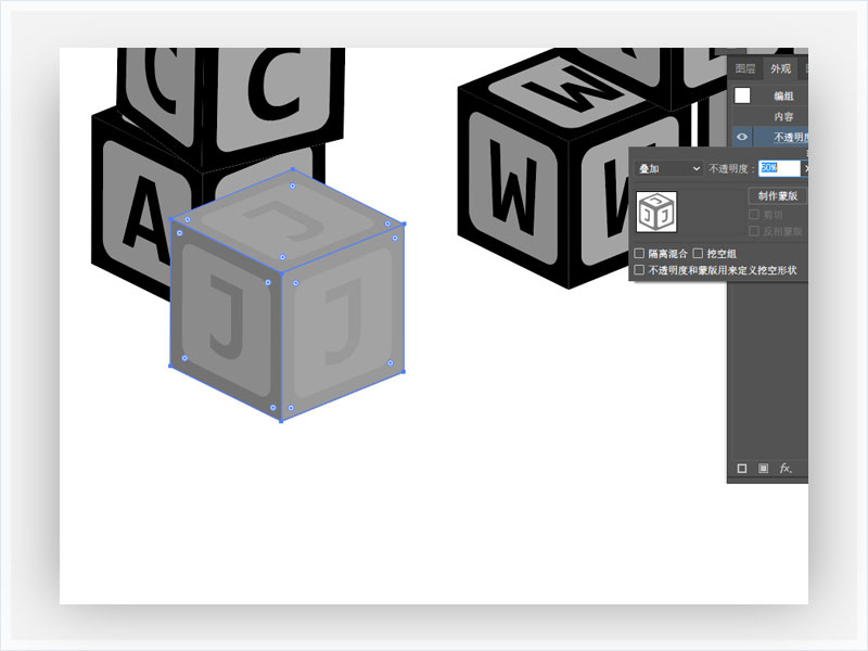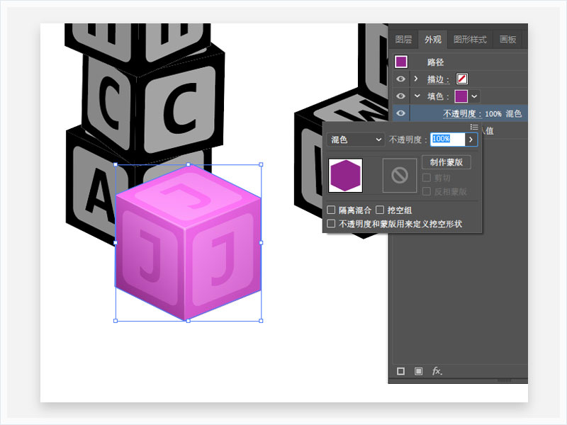 (3)选择字母G的立方体,到“ 图层”面板,将黑色G的组不透明度降低到50%,将混合模式更改为叠加,改组一定要在其他形状之上。 选择带有紫色填充的形状,在“ 外观”面板上将颜色设置为(R = 176 G = 49 B = 1),选中字母G所有形状,编组。