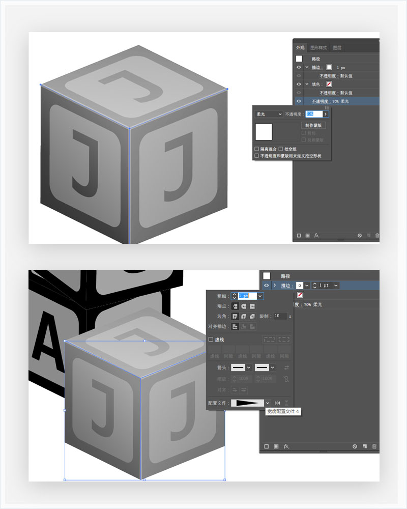 (5)选择三条白色路径,在“ 外观”面板上将不透明度降低到70%,将混合模式更改为柔光。在“描边”中找到“ 配置文件”下拉菜单中选择“ 宽度配置文件4”,并对三条高光进行纵向翻转调整。
