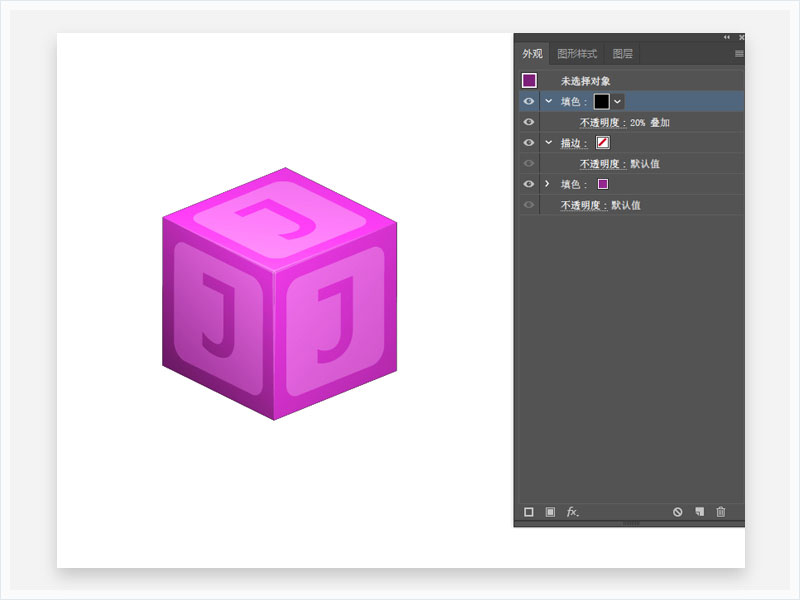 (7)选中紫色形状,继续在“ 外观”面板中使用“ 添加新填充”按钮添加第二个填充(目的是让字母块更真实),不透明度降低到20%,混合模式更改为叠加。