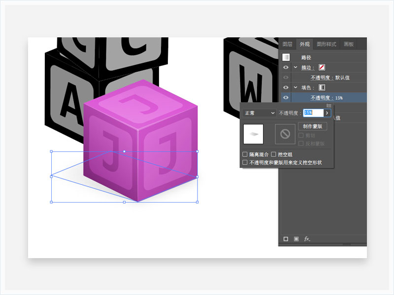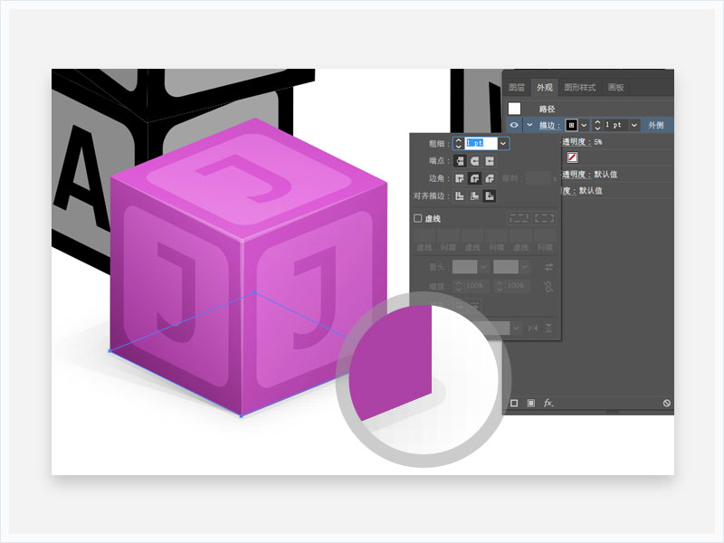 (4)在“ 图层”面板,选择构成多维数据集基础的底部形状,在“ 外观”面板上,关闭填充色,将描边色设置为黑色,不透明度降低到5%,检查圆形加入和对齐行程到外部按钮。