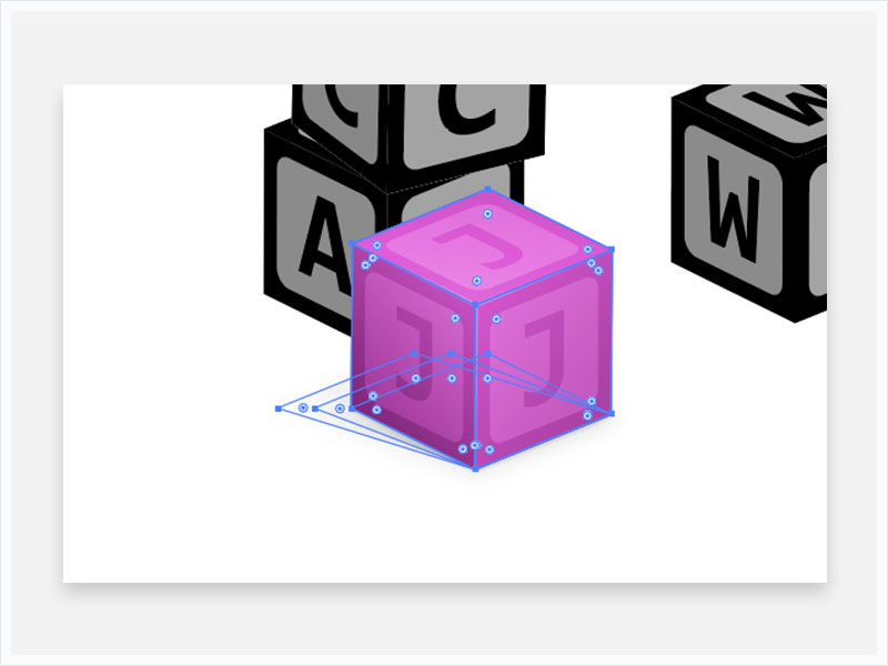 (1)在“ 图层”面板,选择构成多维数据集基础的底部形状,并在后面创建一个副本(Control-C> Control-F)。选择直接选择工具(A),选择顶部的锚点(在第一个图像中突出显示),然后将其左侧拖动约20px,如第二个图像所示。在“ 外观”面板上将颜色更改为线性渐变,不透明度降低到20%,然后转到效果>模糊>高斯模糊。输入3像素半径。