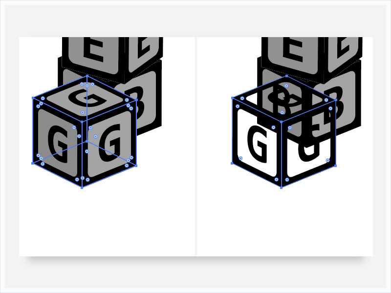 (1)选择其中一个立方体,然后转到对象>展开外观。确保形状组合被选中,并按Shift-Control-G键盘快捷键两次以快速取消分组。到“ 图层”面板,删除构成立方体后壁的两个形状(可以不删除,视个人情况而定,逼死强迫症,偷笑…)。
