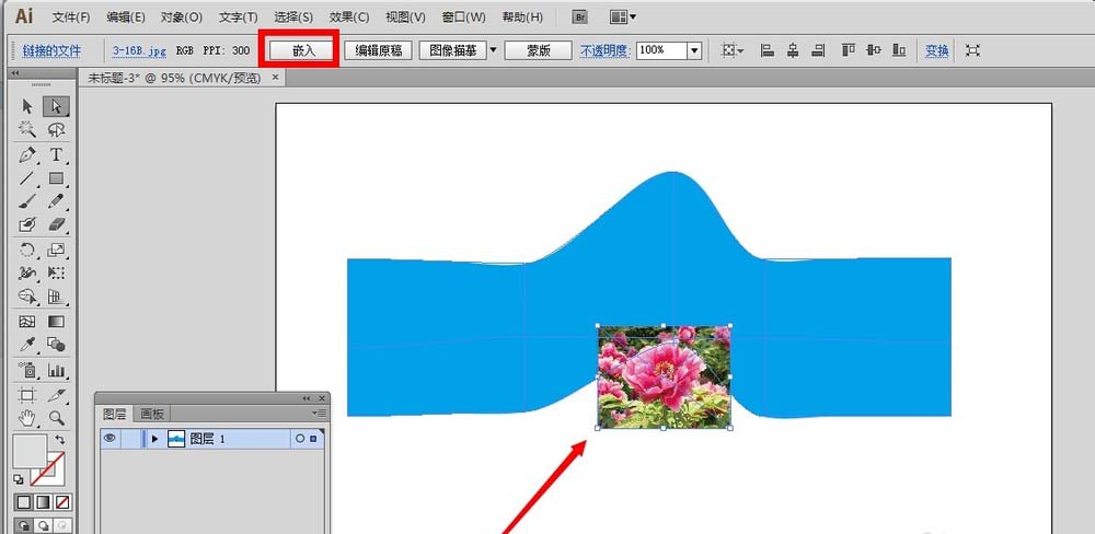3、图片出现画布上,点击画布上面的“嵌入”按钮,成功嵌入我们的图片