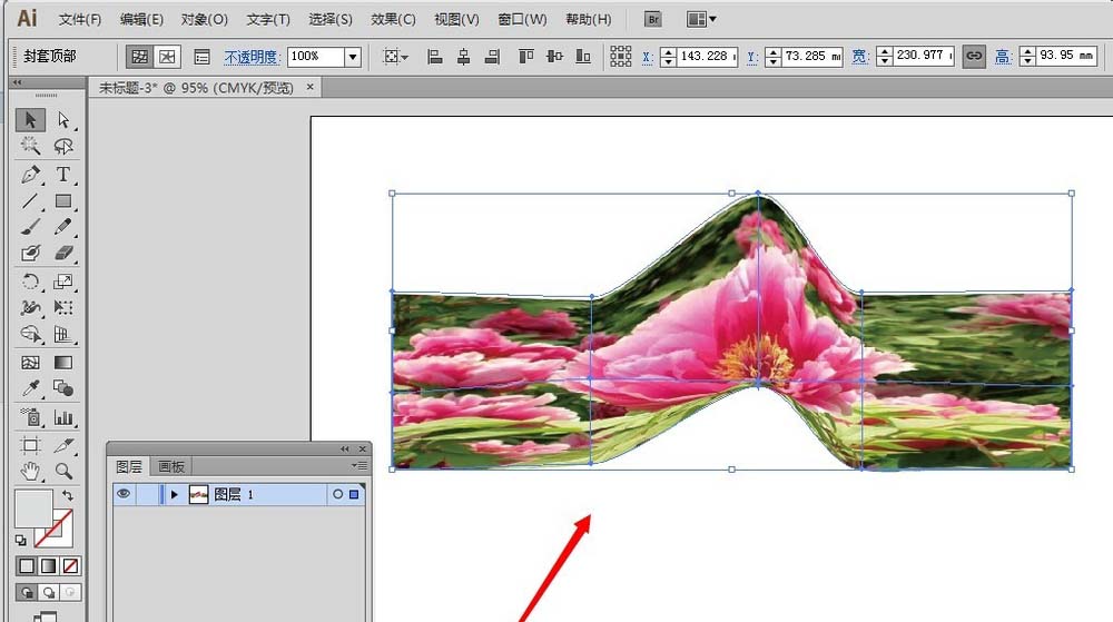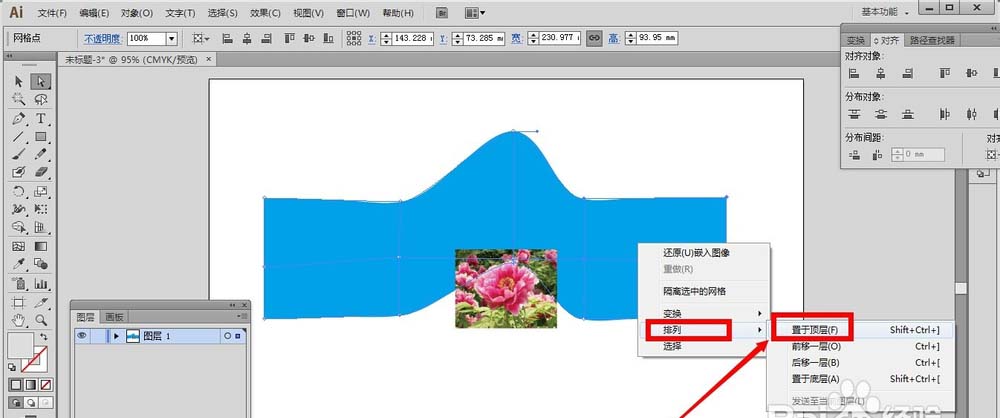 4、接着,把网格封套移动到图片旁边,并且把网格封套放在图片上方,选择封套,右击——排列——置于顶层