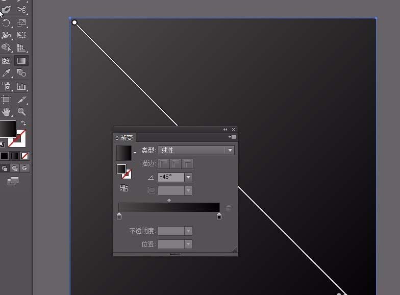 2、按M绘制一个和页面大小的矩形。填充渐变色。①#4c494a②#000000;角度-45°。线性。如图。按ctrl+2锁定对象。