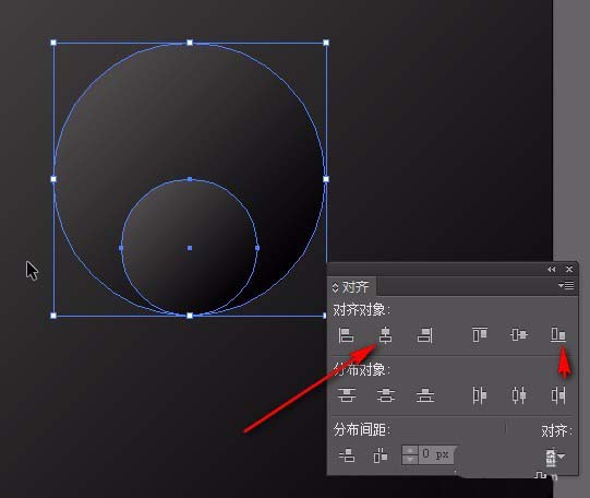 3、按L,绘制一个正圆,点击页面,在弹出的对话框绘制一个250x250的正圆,在点击页面,绘制一个125x125的小圆。先让它们,中间对齐,按shift+F7打开对齐面板,点击对象对齐的水平居中对齐。然后再选择垂直低对齐。
