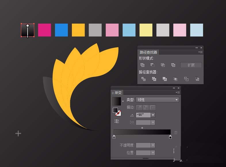 9、删除圆形。如图。框选所有。在路径查找器中选择【分割】;点右键【取消编组】选择第一块填充如图颜色。①#4c494a②#000000;角度-90°。线性渐变。