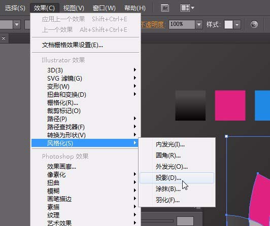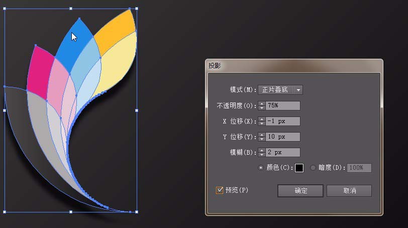 23、选择菜单栏【效果】【风格化】【阴影】X位移:-1,Y位移:10px,模糊:2,点击确定。