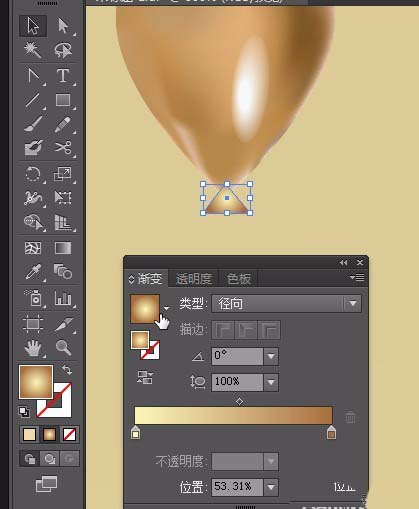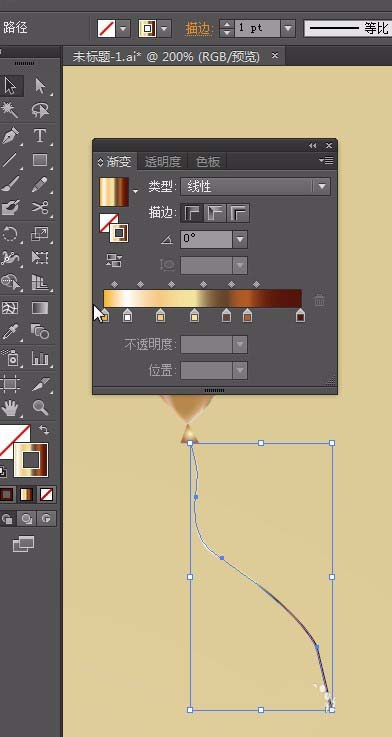 10、选择工具箱中的矩形工具在如图位置绘制矩形;按shift+c,用直接选择工具调整到如图。打开渐变面板[ctrl+f9],将刚刚调整的图形填充从#faf6b5到#a76e3c;并用【直接选择工具】调整。