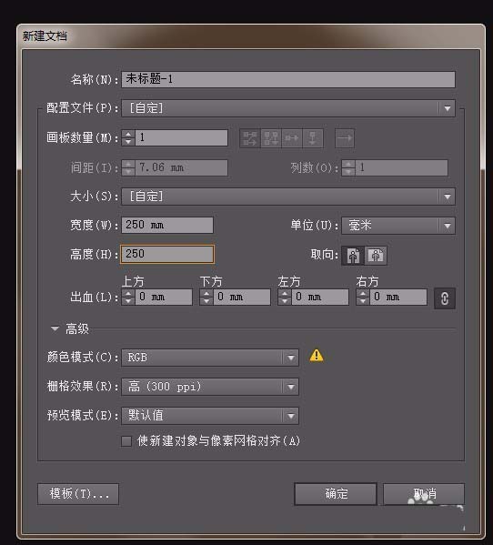 1、新建一图层,大小为250mmx250mm。其他参数如图。