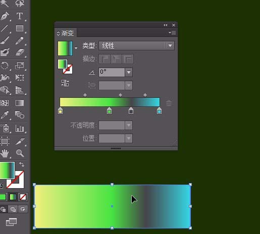 3、绘制一个矩形,按ctrl+f9,编辑渐变面板。输入①#f0f07c②#48e443 ③#444446④#35d8e5;