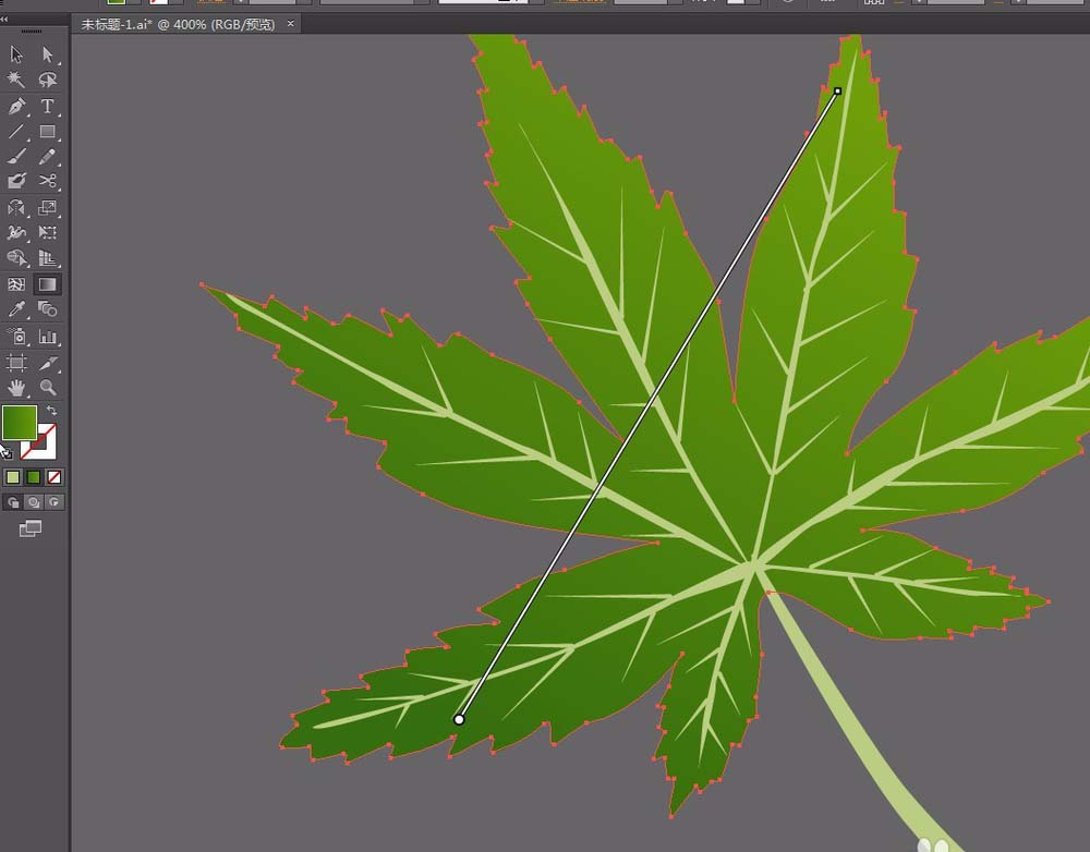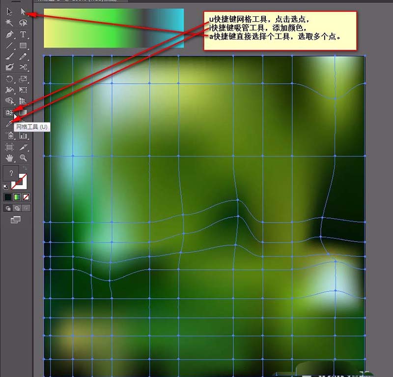 4、用吸管工具【i】吸取需要的颜色,和u【网格工具】点击选点,来给网格填色。填充各种绿;如图。绘制好后,ctrl+2锁住。