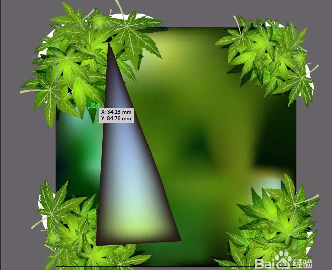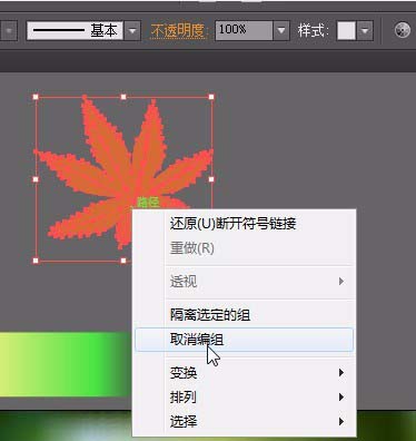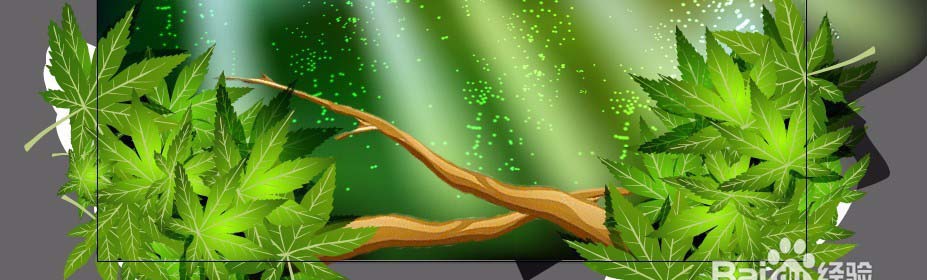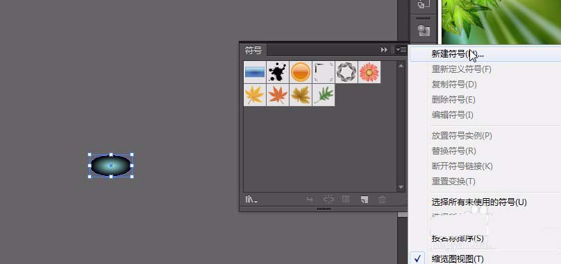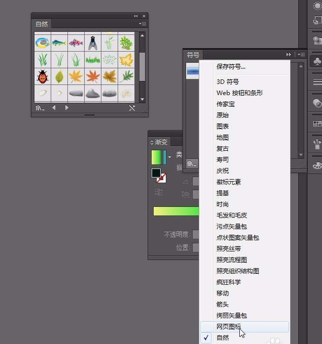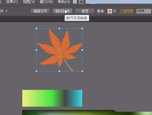 5、在【符号】面板左下角选择【自然】将叶子拖出来。如图。选择一种叶子,选择属性栏【断开连接】右键点击取消编组。填充渐变色。ctrl+F9;①#356e0c②#6e9e09;线性渐变。