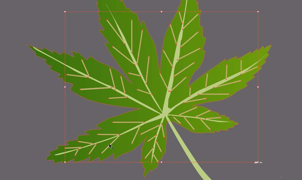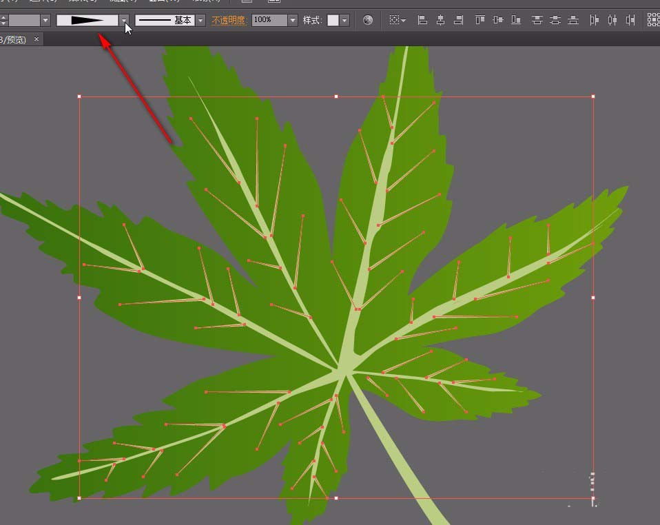 7、用钢笔工具绘制叶脉。在选择工具模式下,按住shift键,选择所有叶脉。选择属性栏的变量宽度配置文件,选择合适的。按ctrl+F10打开描边面板。选择如图。