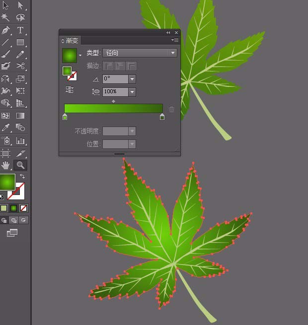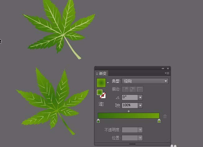 8、按G渐变工具调整下渐变;复制一个叶子。改成径向渐变。颜色为①#6ed109②#35490c;然后给这两个图形编组。