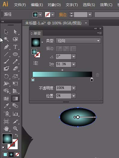15、按L绘制椭圆,ctrl+F9调整渐变色:①#9bf1ee②#000000;径向渐变,中间的渐变滑块位置为:50%,并按G,调整渐变的内部颜色范围。如图。颜色模式为:颜色减淡。并将其定义为符号。在符号面板右上角点击【新建符号】