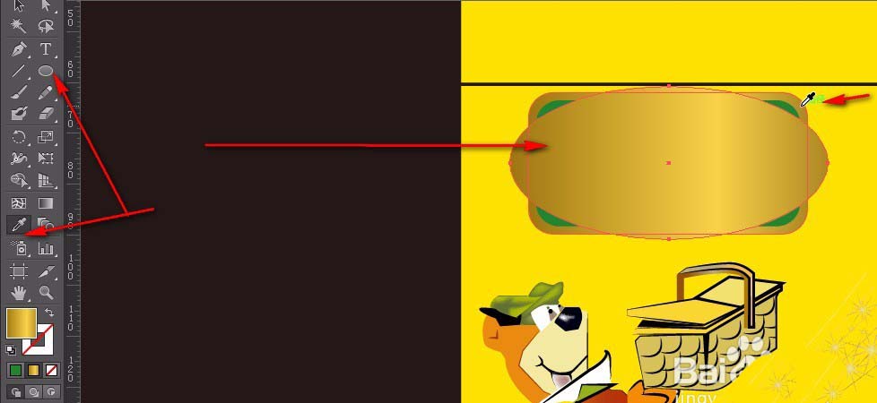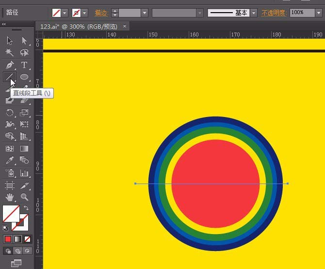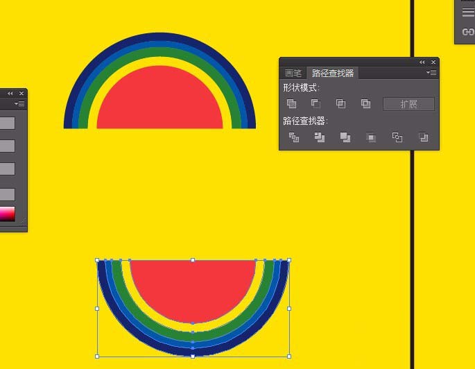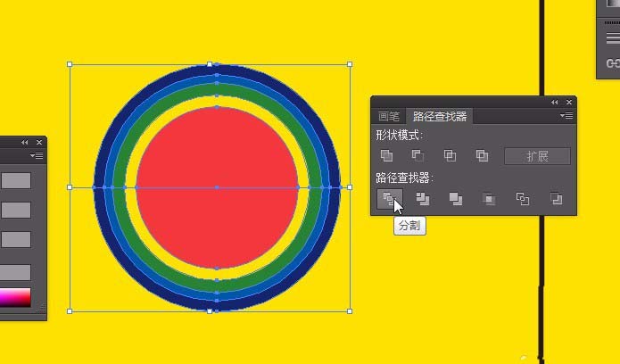 6、用直线工具按住shift,拉出一条直线,如图,然后按,ctrl+shift+F9,打开路径查找器。框选两个对象,点击路径查找器里的分割按钮。如图。完成之后,点右键,取消编组。然后框选下面的另一并删除按delete键。框选对象,按ctrl+g编组。放置在合适的位置。