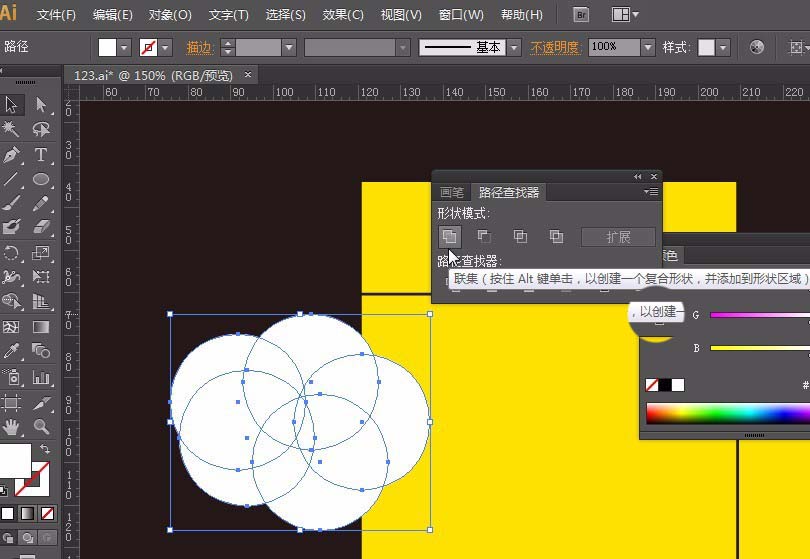 7、选择椭圆工具,按住shift键绘制正圆,如图,然后按住alt键,拖动复制几个,形状云朵形状。框选这几个圆,在路径查找器里选择联集,完了之后,按ctrl+C,ctrl+B,黏贴在后面,用选择拉大一些。然后填充灰色。#51585e;框选这两个,群组,缩小一些放置在合适位置。