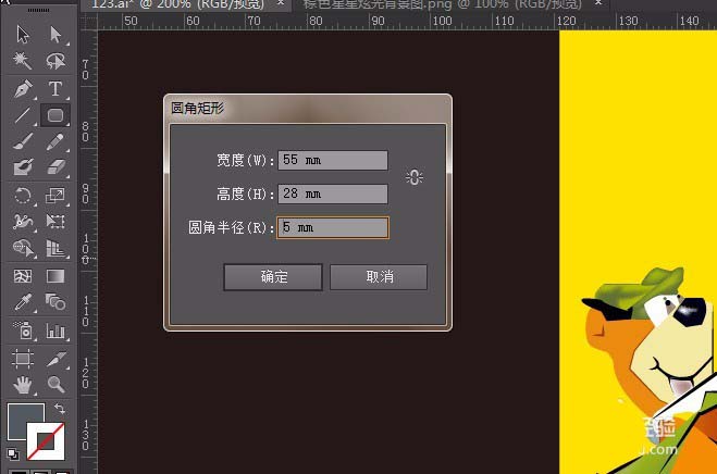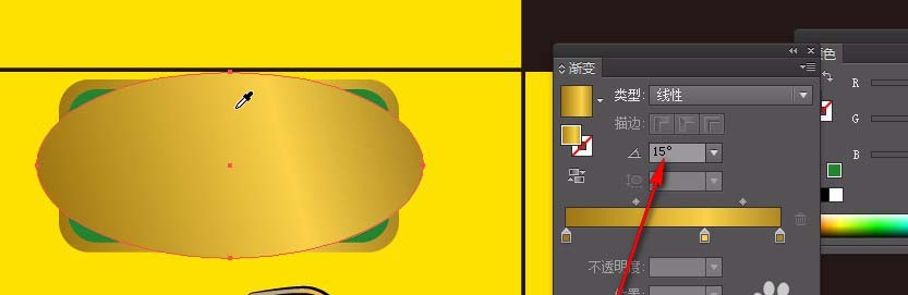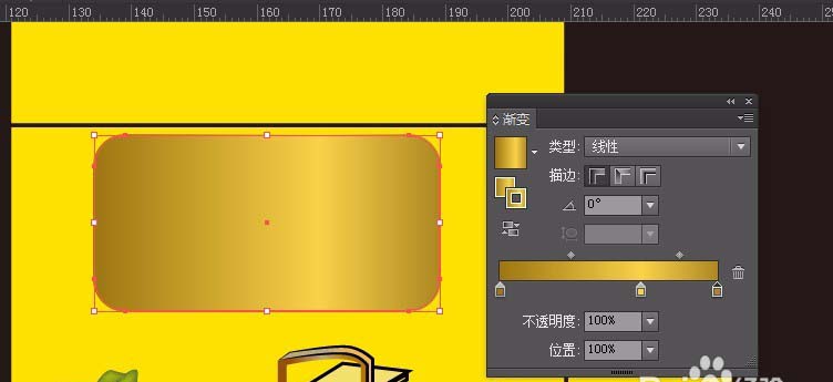 9、点击圆角矩形工具,在页面单击,输入数值,55 28 圆角半径 为5,填充渐变色为①#9d7611②#f9d247③#ac8822;按ctrl+c,ctrl+f粘贴在前面。按住shift+alt键,由中点点等比例缩放,填充#23842f;然后按住alt键拖动一边,调整一下。
