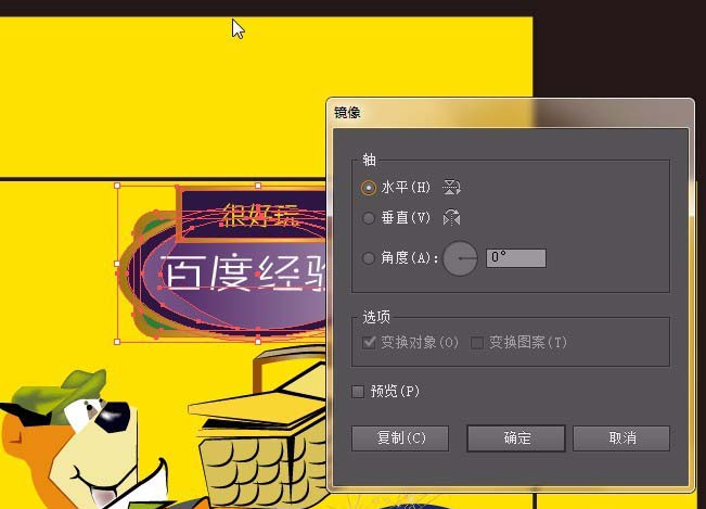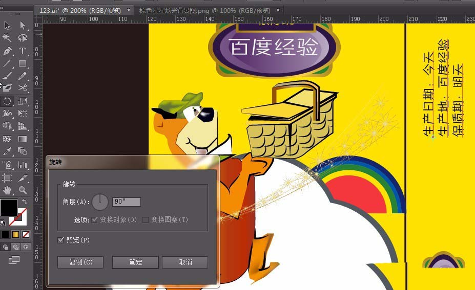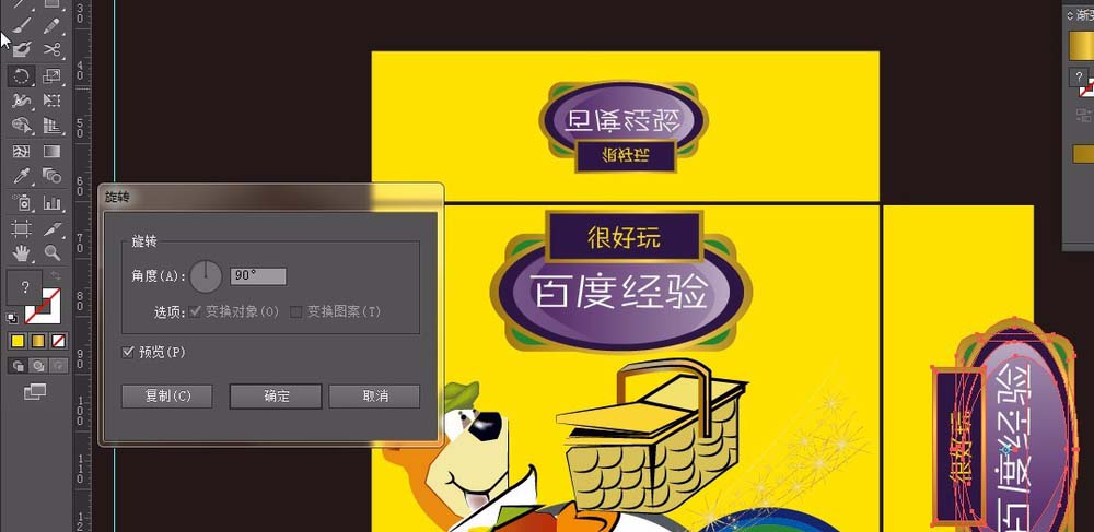 15、按住alt键,复制一个,双击旋转按钮,输入90°。点击确定。缩小一些。找到文字工具,单击一下输入需要的文字。完了之后,双击旋转,点击确定。完成之后,按ctrl+alt+2解锁群不对象。每个面该群组的都群组。