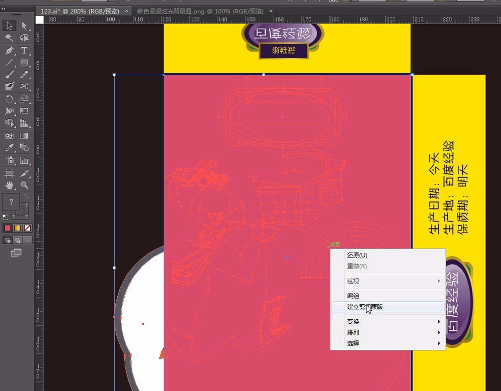 16、绘制一个矩形,填充随意颜色,按住shift键,选中需要处理的图层,点右键创建剪切蒙版。点击确定。按ctrl+o打开文件选择星光,按住alt键放置在不同位置,按住ctrl+c,ctrl+V,粘贴在页面中,调整位置旋转不同角度。