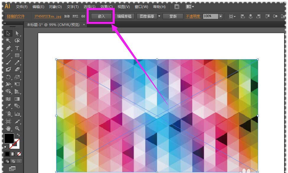 1、首先需要在电脑上下载安装一个AI软件,打开安装好的AI软件,将任意一张自己喜欢的图片直接拖到软件里面。拖图片进去之后,再点击图片上方工具栏里面的”嵌入“按钮,确定图片的嵌入使用。