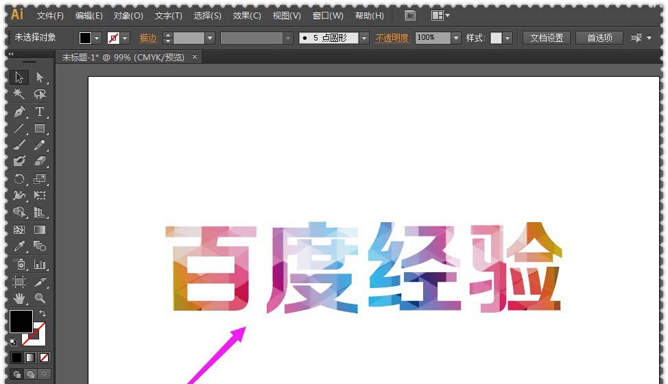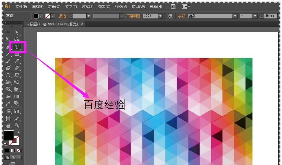 2、接着,在AI软件左侧的工具栏里找到”文字工具“,用鼠标点击”文字工具“之后,再在图片上方特定的位置上点一下,看到闪烁的光标之后,直接输入自己想要的文字内容。