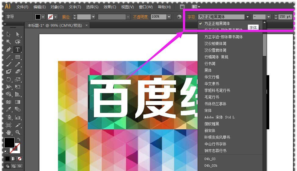 4、在界面左上方的工具栏里找到”选择工具“,即点击黑色箭头的按钮,使用”选择工具“点击一下整个文字内容,选中它,然后再在上方的菜单栏里点击”文字“,出现下列列表之后,再点击里面的”创建轮廓“的选项。