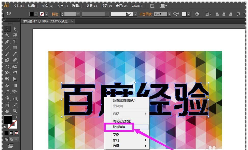 5、小伙伴们把特定的文字内容转换为轮廓之后,再在选中全部文字内容的前提下,直接右击鼠标,在出现的列表面板上选择”取消编组“的选项。