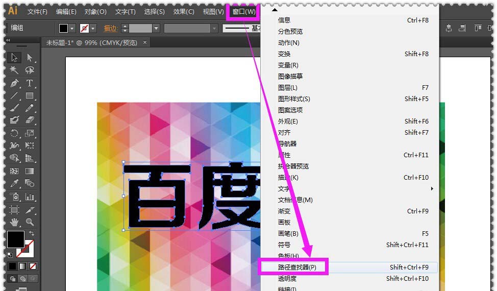 6、接着,小伙伴们再在界面上方菜单栏里面找到”窗口“选项,用鼠标点击它,然后在弹出来的下拉列表里面找到”路径查找器“的选项之后,点击”路径查找器“。