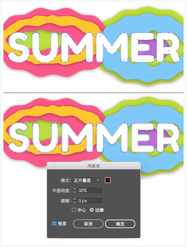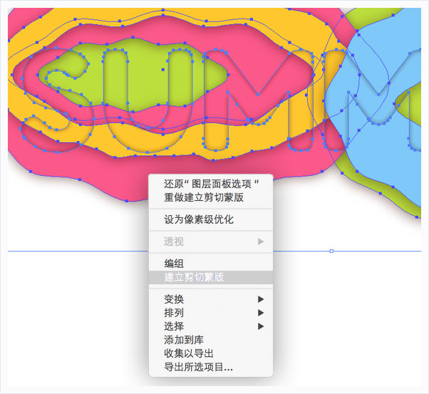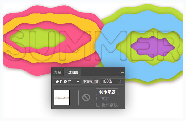 使顶部的“SUMMER”副本再次可见,选择所有对象(Control+A),然后单击鼠标右键> 建立剪切蒙版。这样,我们将所有的对象都隐藏在顶部形状内就像放在容器中一样。 如果需要,我们仍然可以在剪切组内移动对象。