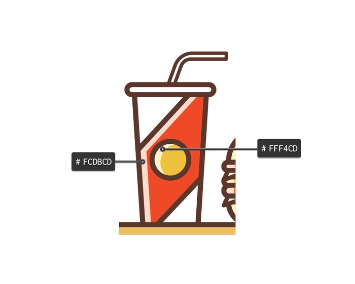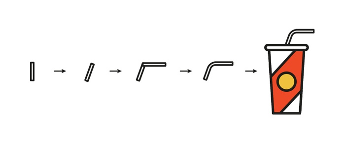 对于吸管,绘制一个7 x 44px的矩形(颜色:#FFFFFF),描边为4px,并在变换面板中旋转340º。添加另一个56 x 7px矩形(颜色:#FFFFFF),选中两个形状在路径查找器中选择联集。使用直接选择工具(A),使直角轻轻弯曲。最后,将吸管元素(Cmd/Ctrl+G)组合放置在杯子后面。