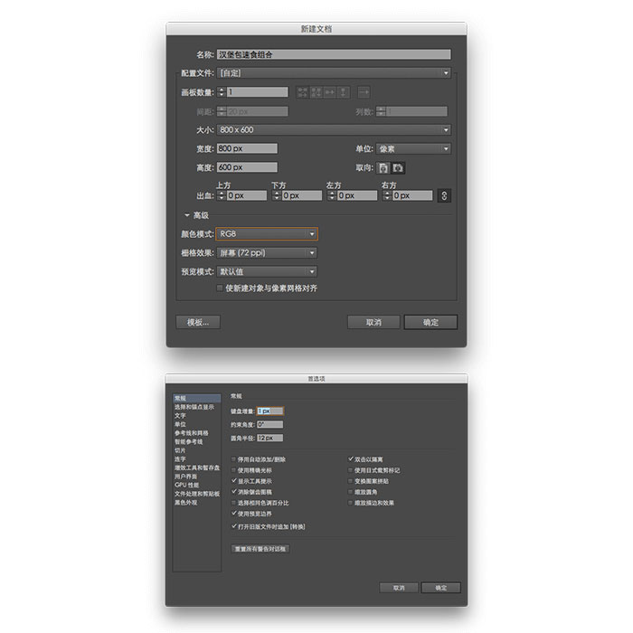 按Cmd/Ctrl+N创建新文档。将单位设置为像素,大小设置为800 x 600px。在高级选项中,将色彩模式设置为RGB,分辨率设置为72ppi。