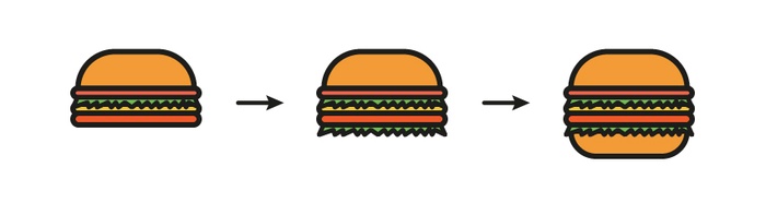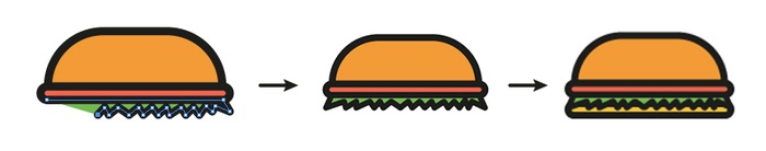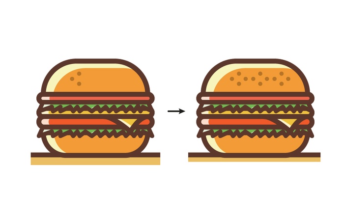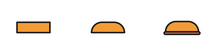 让我们从汉堡开始吧。选择面包的内部形状并复制两次(Cmd/Ctrl+C> Cmd/Ctrl+F)。然后,向右移动第二个副本,稍微向右移动,然后选择减去顶层,填充颜色改为#F8F5BC。