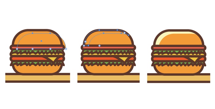 我们要添加一些奶酪在汉堡层之间流出来。使用钢笔工具绘制,并给它填充颜色:#EFC206,如下图所示。选择汉堡包并组合所有内容(Cmd/Ctrl+G)。