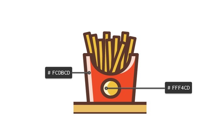 添加炸薯条。绘制一个10 x 120px的矩形(#EFC206),并将描边设置为5px。制作各种副本(Cmd/Ctrl+C> Cmd/Ctrl+F),旋转一些,并将它们放置在包装盒后面。
