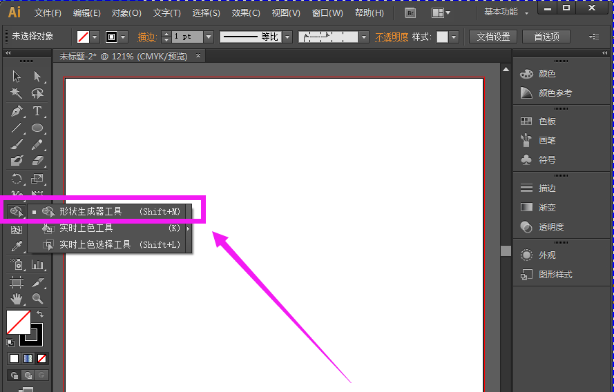 2、我们先来知道下形状生成器工具在哪里,它在ai左侧工具栏中靠近中间的位置,如下图所示。