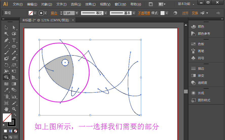 5、框选之后,我们再来使用形状生成器工具选择我们需要的部分,如下图所示。我们需要哪个区域,就选择哪个区域。就如上面的视频所示哦~
