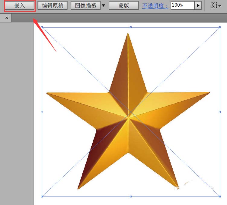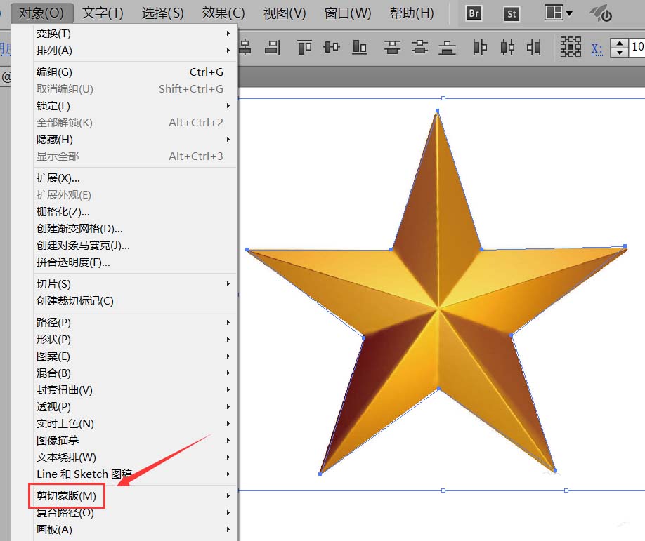 5、点击嵌入选项后,在工具箱内找到钢笔工具,使用钢笔工具在图像上画出路径,选择图片和路径,在对象菜单哪里找到剪切蒙版选项,如图所示: