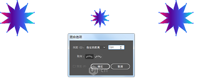 6、全选3个几何形状,按W执行回车键,调整混合方式为指定距离 值为1PX 再执行CTRL+ALT+B混合工具进行连接混合(混合后可以看到3个几何形状被连接起来)