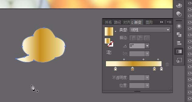 2、用钢笔工具绘制一个形状。填充线性渐变色①#fcf3ca②#c68f1c③#e8d486④#f5eedf;