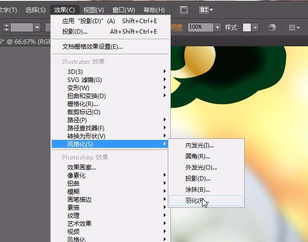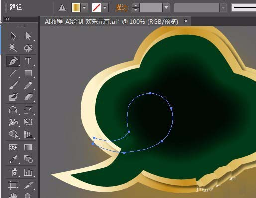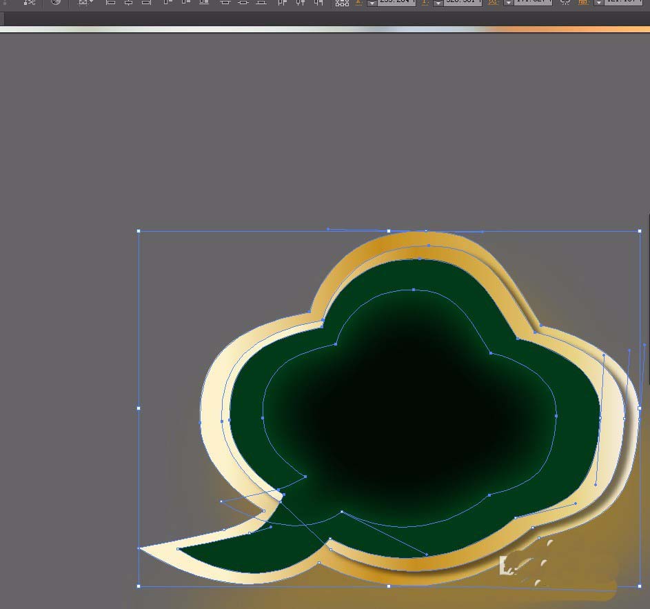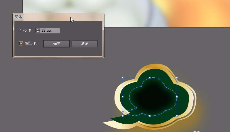5、在复制一层在上面。填充3000a02,在菜单栏点击【效果】【风格化】【羽化】羽化值:12mm 点击确定。拉大一些。调整绿色的点到如图位置。用直接选择工具调整。
