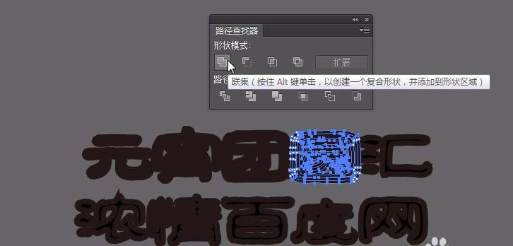 9、在菜单栏点击对象,扩展。按ctrl+shift+F9打开路径查找器。给文字做联集效果。然后选中对象,右键点击编组。然后给文字添加渐变色①#005b2f②#02371a;角度为-15°。放置在页面中如图位置。