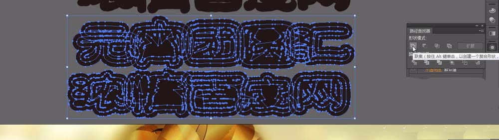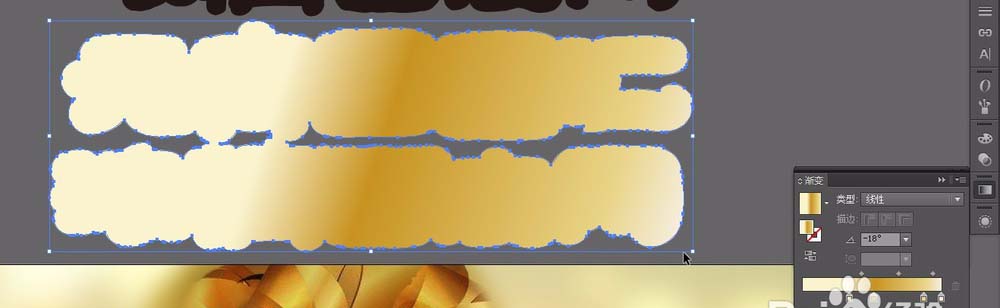 11、用直接选择工具将多出来的尖角拖回去。完成之后全选,在路径查找器里选择【联集】用吸管工具吸取渐变色,在渐变面板改角度为-18°。完成之后,在属性栏更改混合模式为正常。放置在文字第三层。如图。