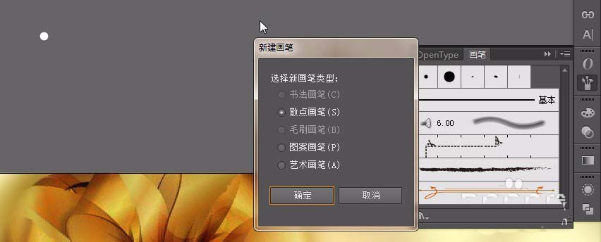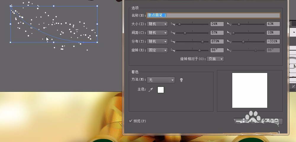 14、点击椭圆工具。按住shift键绘制一个正圆。按F5将画笔面板调出来。将绘制的圆丢进面板。在弹出的菜单选择散点画笔。点击确定。在工具箱选择画笔在页面绘制一个弧线。双击画笔面板里刚生成的笔尖形状。在散点画笔选项里数值调整如图。点击确定。完成之后,复制多方到花上。调整不同角度和位置。如图。框选群组。在属性栏选择叠加混合模式。